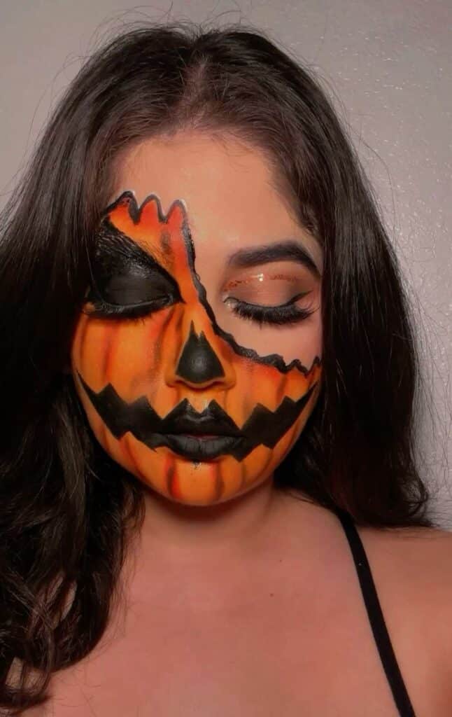 Β‘Este look de Jack-o’-Lantern (calabaza de Halloween) es puro impacto! Con Γ©l, cubres la mitad del rostro con tonos vibrantes de naranja y negro.