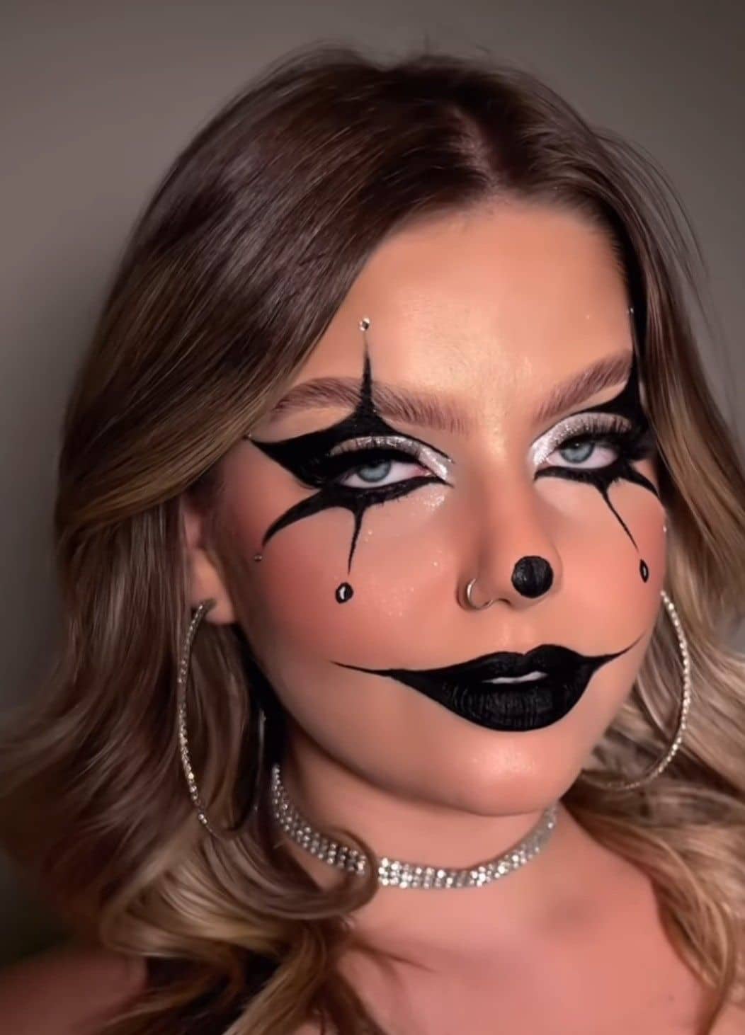 - Dato Extra: El labial negro y la nariz redonda tambiΓ©n en negro finalizan la transformaciΓ³n. Β‘Usa joyas brillantes en el cuello para amplificar el glam! π