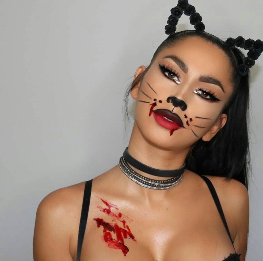 - TΓ©cnica Clave: Dibuja los bigotes y la nariz con delineador negro. Usa labial rojo vibrante y aplica “sangre” goteando de un lado de la boca.