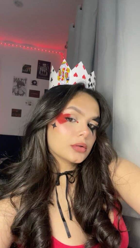 - TΓ©cnica Clave: Usa pintura facial roja y negra para dibujar formas geomΓ©tricas (corazones, estrellas, triΓ‘ngulos) alrededor de los ojos y las mejillas, simulando palos de baraja.