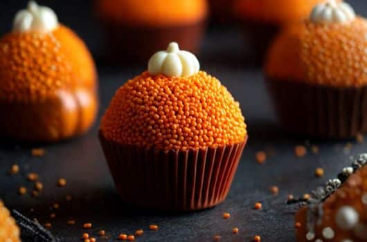 El Brigadeiro (trufa cremosa brasileña) se disfraza con el color emblemático de Halloween. Esta es una de las opciones de Postres de Halloween Fáciles más ricas, ya que combina la dulzura de la leche condensada con el sabor especiado de la calabaza. ¡Es el bocado perfecto para la temporada! 🍁